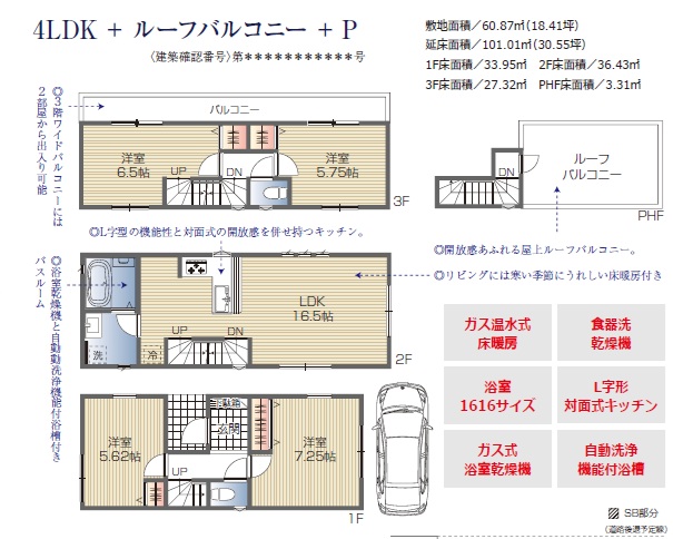 備考地盤調査済、3階建、全居室フローリング、全居室収納、床下収納、システムキッチン、食器洗乾燥機、浄水器、浴室乾燥機、浴室1坪以上、シャワー付洗面台、温水洗浄便座、都市ガス、複層ガラス、TVモニタ付インタホン、小屋裏収納